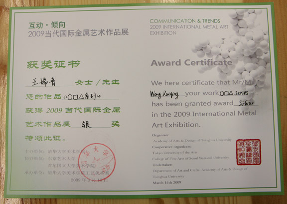 3月17日上午,互动•倾向——2009当代国际金属艺术作品展颁奖典礼在京举行,永利官网美术馆副馆长王瑞青创作的反映环保题材的金属艺术作品《○□△系列》获得银奖,永利官网教师郭建永不锈钢作品《乳》入围。2009当代国际金属艺术作品展暨学术研讨会由中国清华大学美术学院主办,日本东京艺术大学、韩国首尔国立大学美术学院协办,清华大学美术学院工艺美术系承办,永利官网专业网站《设计•中国》(