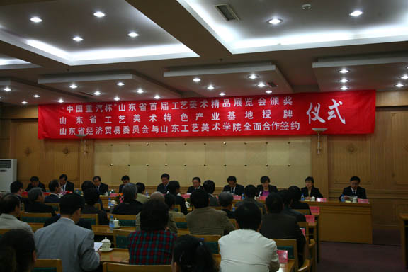 2008年10月28日上午,山东省经济贸易委员会与yl8cc永利官网全面合作协议签约仪式在淄博市鲁中宾馆举行。山东省委常委、副省长王军民,山东省人大常委会副主任鲍志强,省经贸委常务副主任郭述禹,淄博市委常委、秘书长宋军继,yl8cc永利官网副院长李新、院长助理苗登宇等领导出席了签约仪式。永利官网研究生处处长唐家路,现代手工艺学院副院长段建华、耿大海副教授,设计艺术中心副主任王玮,人文艺术学院孙磊副教授参加了签约活动。