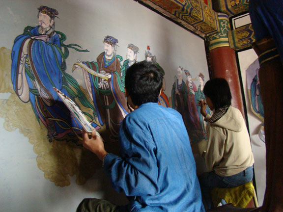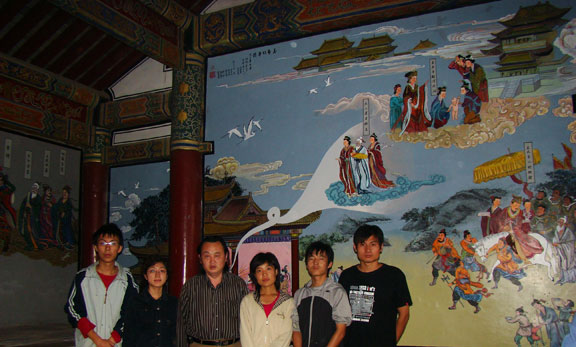 6、大学生文化宣传服务团。 响应团中央,团省委提出的“文化下乡”的要求,组织大学生文化宣传服务团,传播文化,用实际行动阐释志愿精神、展示青年风采、提升公民素质。 (1)现代手工艺术学院赴泰山文化创意与宣传小分队 7月16日在yl8cc永利官网客座教授叶兆信老师、现代手工艺术学院党总支书记、副院长段建华老师及孟老师带领下,现代手工艺术学院05、06级7名学生组成的壁画小组来到了五岳独尊的泰山,到达了最高峰玉皇顶开始了长达一个多月的“泰山文化创意与宣传”的历程。 本次活动同学们主要负责玉皇庙中玉皇大殿的三面墙壁的绘画修饰。壁画内容是围绕玉皇大帝展开的神话传说的主题绘画。内容丰富多彩,人物形态栩栩如生,让学生们领略了中国宗教文化的博大精深以及古代神话传说的神韵传奇,也以绘画的形式传播了宗教文化,让更多的人去了解它。