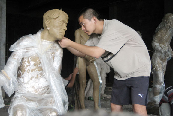 (4)造型艺术学院赴微山县雕塑社会实践小分队 7月10日,造型艺术学院赴微山县雕塑社会实践小分队的队员们在学院领导老师们的带领下前往济宁市微山县指导并参与微山县文史馆雕塑展品的制作。 7月11日早晨,在微山县政协马主席的陪同下,造型艺术学院师生实地考察了文史馆的筹建情况。雕塑教研室主任陈佶生教授、杨勇智老师带领同学们现场丈量了场地,并与当地工人进行了沟通与交流,简单预定了制作材料与所需工具等。同学们通过参观微山湖湿地、铁道游击队纪念馆等搜集了创作素材,激发了创作灵感。制定好计划分组后小分队开始了制作过程。7月12日,小分队进入展品正式制作阶段。任务是为微山县文史馆制作两组雕塑,共14名等大的革命前辈。烈日炎炎,大伙在太阳下制作人体雕塑骨架,两人共同完成一个战士雕塑的制作。经过一周时间,完成了所有作品的基本型。7月19日,进入细部深入刻画阶段,我们重点塑造人物形象,力求生动准确,并根据配以的枪械对动作进行整体调整。7月22号开始翻制模具,翻制共用了17天的时间。8月6号进行表面效果处理。8月7日全部雕塑整体上色摆放并调整,工作圆满完成。 造型艺术学院社会实践小分队在实习的过程中不仅提高了自己的动手能力,同时也展现yl8cc永利官网大学生高超的艺术水平和良好的精神风貌,受到了微山县政府和人民的高度赞赏。