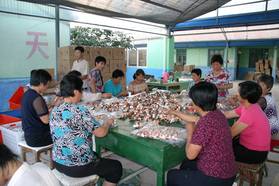 在高密,调研小组走访了姜庄、夏庄等乡镇,既考察了扑灰年画、剪纸等传统工艺美术的生产现状,也对新兴的毛绒玩具产业进行了调研。被誉为中国民间艺术“三绝”的扑灰年画、泥塑和剪纸,其生产状况虽不复往日盛景,但依然在民间传承延续,各户独立经营,未形成大规模的产销企业。在各自的发展过程中,艺人们也根据自身的情况与市场的需求自发进行了一定的调整。毛绒玩具是高密近年来兴起的工艺产业,它依托于当地民间传统玩具制作工艺及大量闲散劳动力资源而发展兴盛起来。高密现有150多家中小规模的毛绒玩具厂,采取“终端企业——加工点——农户”的组织形式,形成了高度分工合作的流水线生产模式。目前,毛绒玩具产业呈持续扩大的趋势。