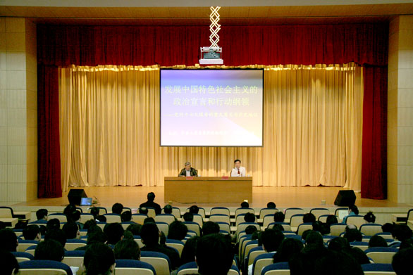 商志晓教授的报告题为《发展中国特色社会主义的政治宣言和行动纲领——党的十七大报告的重大意义与历史地位》。商志晓教授认为,十七大报告是建设中国特色社会主义的宣言书、指南针和动员令。十七大报告立足当前、关注长远,立足全局、关注重点,立足发展、关注和谐,立足国运、关注民生,立足世界、关注和平。