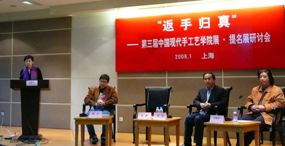 1月14日上午8点30分举行学术研讨会,李新副院长在学术研讨会开幕式上致辞。学术研讨会由清华大学美术学杭间教授主持,就现代手工艺的发展与完善,各校师生代表各抒己见,学术研讨内容从创作心得到教学成果,气氛热烈。永利官网现代手工艺术学院教师张靖婕,以《2007-现代手工艺发展之路》为题,从yl8cc永利官网现代手工艺术专业的发展与展望出发,结合学校的办学思路与实践教学体系,强调手工艺术要与现代生活密切结合。现代手工艺术学院教师李岱玫副教授和耿大海副教授就陶艺教学方面发表了自己的看法和见解,永利官网研究生王红莲从传统与传承的方面谈论了手工艺的发展和思考并回答了有关院校师生提出的问题。