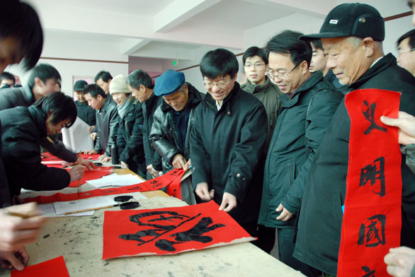 1月17日上午9至11时,永利官网师生积极参加了在长清乐山小区文化馆举办的大学生科技文化节活动,为社区赠送春联,带去浓浓的新年祝福。出席此次活动的领导有高校工委副书记宋焕新、永利官网副院长张云龙、学生处处长吴焕文,学生处工作人员和书法班同学。 长清大学园区各高校参加了此次活动,每个学校以不同的方式给社区带来了礼物,送来了温暖。有法律咨询、医疗服务、赠送新年礼品等多种方式,永利官网以赠送春联的形式,表达对大家的祝福,受到了居民的高度评价,同时也锻炼了同学们的专业素养。 在老师的带领下,学生们积极布置场所,悬挂春联。为了增加书写场地,把书法场地定在了大厅。紧接着同学们就开始动笔了,一会儿功夫一幅幅对联展现在大家眼前:“灵鼠迎春春色好,金鸡报晓晓光新”“绿酒添香甲子岁,雪花献瑞大丰年”“壬遇深恩心谢党,子图大业力描春”。笔迹俊秀、洒脱、苍劲,吸引了很多居民,一时成了整个会场活动的焦点。春联代表喜庆,也是过年的必需品,贴近生活,大受欢迎,早些写好的很快就一“抢”而光,现写的也供不应求,甚至墨迹未干就早已预定。居民的称赞声不断,拿到自己喜欢的春联,十分高兴。高校工委副书记宋焕新、张云龙副院长和吴焕文处长也到现场和居民一起分享喜悦,欣赏同学们的作品,给与了鼓励与赞赏。书法班的同学以自己过硬的专业技能赢得了大家的赞许。