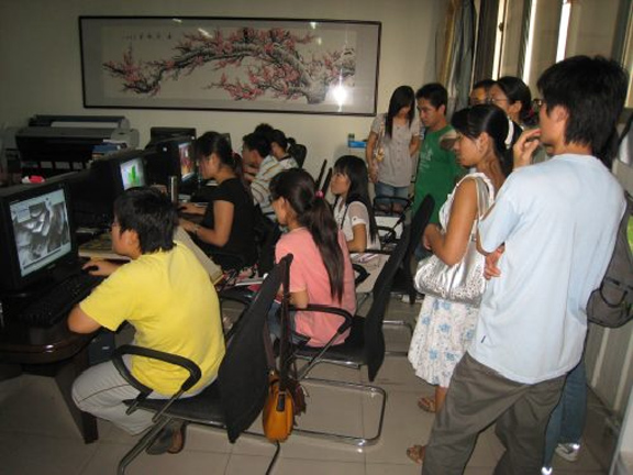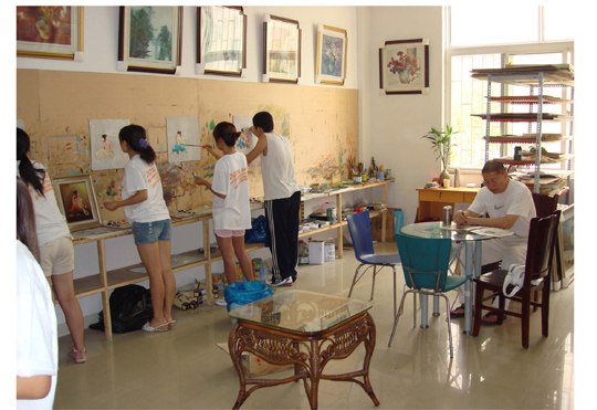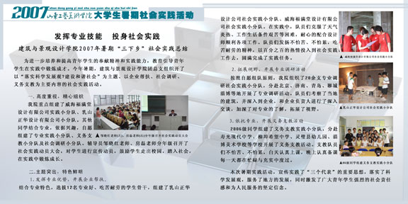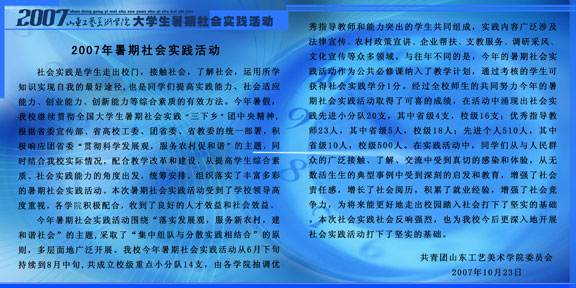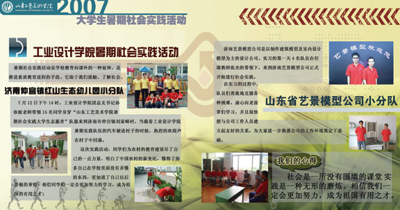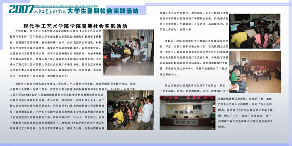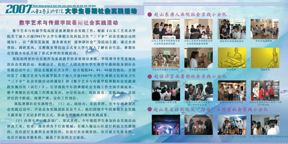 (2)数字艺术与传媒学院调研采风小分队 2007年7月11日—7月21日,数字艺术与传媒学院06级动画与影视专业一行共34名同学赴山东省唐人书画院进行浮雕油画创作与三维雕刻软件学习与实践。唐人书画院隶属于山东省文化厅和山东省残疾人福利基金会,拥有制作软浮雕的一项专利,属于数字艺术与传媒学院动画专业的周边产品。在本次实践的过程当中,同学们充分利用本专业优势,在绘画、计算机三维创作等方面实现产、学、研一体化,为唐人画院创作了优秀的商业作品。以此次社会实践为载体,数字艺术与传媒学院与山东唐人画院建立起长远的合作伙伴关系。山东教育电视台以及山东电视台教育频道对此次实践活动进行了专访和相关报道,采访并录制了同学们的学习过程,于7月18、19日在山东教育台播出,在社会上引起了强烈反响。