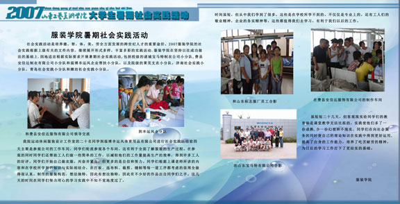 2、企业帮扶 组织学生充分发挥自身专业特色,联系实际,深入与自身专业有关的企业、工厂、公司等,了解企业,帮助企业进行开展产品设计与开发、市场策划与营销、规范管理、职工培训、政策法规咨询等方面的工作,为企业的可持续发展提供帮助。 (1)服装学院企业帮扶小分队 活动前服装学院辅导员老师召开了2006级全体学生大会,讲清各种相关事宜。各班同学积极响应、认真落实,根据自身专业特点,确定实践方向,作好动员工作。广大同学都以认真的姿态对待这次大学生社会实践活动,锻炼了社会交往能力,培养了同学的综合素质。服装学院组织的诸城宝马特制衣公司小分队、费县安信达制衣有限公司小分队、莒县标志服厂小分队和淄博幸运风企业帮扶小分队四支小分队也出色地完成了任务。他们组织学生到实习基地实地考察、学习,使学生走出校园,了解服装企业的生产流程和工序,学以致用。实践使他们多了一份成熟,少了一份幻想和不现实。同学们在向社会提供服务的同时,使自己所学的理论知识得以运用于实际,提高了自身的工作能力,培养了吃苦耐劳的精神。