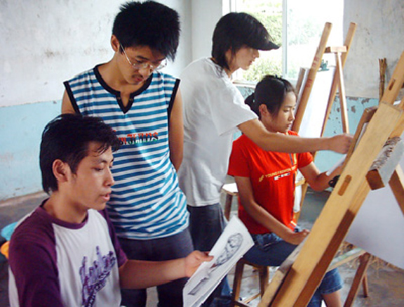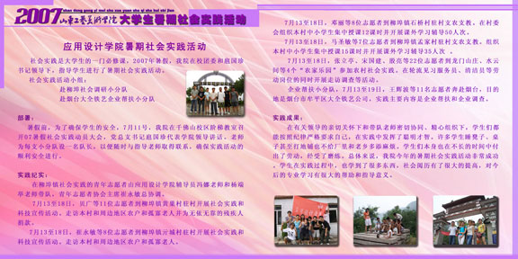 (3)造型艺术学院赴烟台栖霞艺术学校支教小分队 由造型艺术学院7名同学组成的赴烟台栖霞艺术学校支教小分队在团总支书记郑楠的带领下于2007年8月17日至8月24日进行了为期8天的支教生活。 在此期间,同学们了解栖霞艺术学校的历史及现状,熟悉学校的各项教学条件,深入学生教室和学生宿舍与学生进行交谈,了解学生的学习情况、暑假生活及心理状况。队员们与学生座谈,为他们介绍yl8cc永利官网的学校概况、办学特色,讨论如何备战高考等并且在学校专业教师的指导下,进行授课,体验课堂教学,带领学生们创办了11期宣传栏,包括学生优秀作品宣传栏、军训宣传栏、心理健康知识宣传栏、生活小贴示等内容,美化了校园环境,丰富了同学们的校园文化生活,受到了校方领导、老师同学们的大力赞赏和好评。