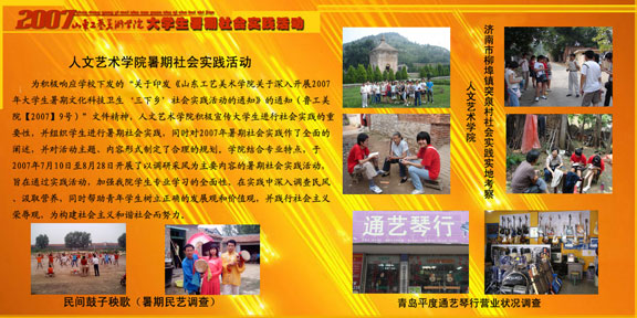 3、调研采风 在广大学生中开展艺术调研和采风实践活动,深入民间进行艺术考察,拯救濒危民间艺术,呼唤人文精神,提炼生活品格。培养学生“勤于思考、勇于实践”的良好精神风貌以及宏扬热爱民族文化的传统,引导学生意识到要担负起传承民族文化的责任。 (1)人文艺术学院赴济南历城区柳埠镇突泉村调研小分队 7月10日,人文艺术学院社会实践小分队顺利抵达目的地——历城区柳埠镇突泉村。11日,同学们展开对突泉村的实地考察。在前两次对突泉村调研的基础上,此次考察延续近郊农村现代化这一主题,作了更为深入、细致的调查。荣新老师对此次参加社会实践活动的12人作了具体的任务分组、分工和要求,12名同学共分为四组,分别负责考察四个具体的专题:现代化、城市化进程中村民生活发生的变化及其存在的问题,农家乐以及相关的由于旅游业发展而带动的其它产业、村政管理问题和儿童教育问题。 考察期间,同学们迎着高温酷暑,满怀热情,根据事先制订的调查提纲,耐心细致地就各自的专题进行了调研,收获颇丰。每天考察结束之后,同学们不畏辛苦,晚上及时进行总结,大家畅谈一天的收获,交流心得,提出存在的问题,共同商议解决的办法,保证了调研的有效开展。