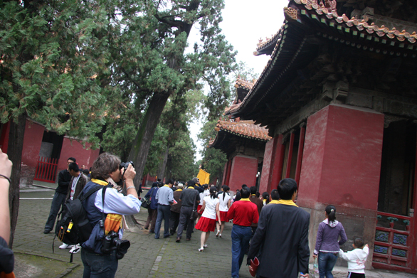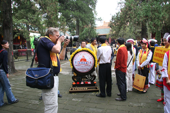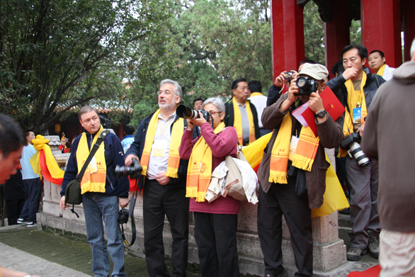 上午8时,参加采风的摄影大师抵达祭典现场——孔庙。离祭孔大典正式开始还有1个半小时,祭孔现场却早已人流如织。爬上栏杆,登高远眺,捕捉瞬间的摄影记者;身着云南服饰参加祭典的姑娘;统一着装、列队迎宾的青年志愿者以及积淀中国悠久历史和传统文化的雄壮建筑等尽收摄影大师的眼底。9时30分,优雅的祭孔乐声响起,祭孔大典正式开始,在古典优美的音乐、舞蹈中,摄影大师们效仿鞠躬祭孔。随着相机的快门声,摄影大师们用独特的视角和现代化的数码语言记录下了中国传统的祭典盛事。