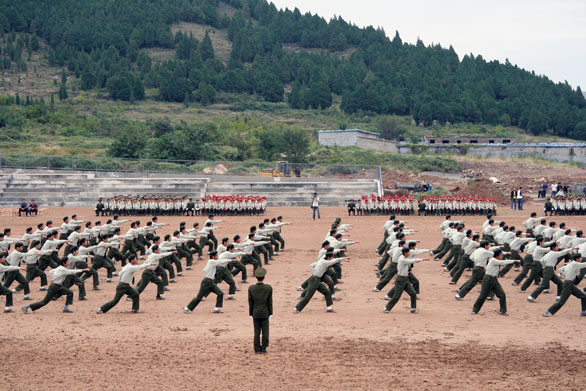 检阅了全体参训新生。随后军训汇报表演正式开始。各方队伴着豪迈的乐曲声依次入场。齐步走、正步走,同学们步伐整齐、口号响亮,走出了美院人的神采,喊出了美院人的气势。威武雄壮的军体拳引来了全场的阵阵喝彩,整齐划一的旗语表演展现了美院女生的飒爽英姿。