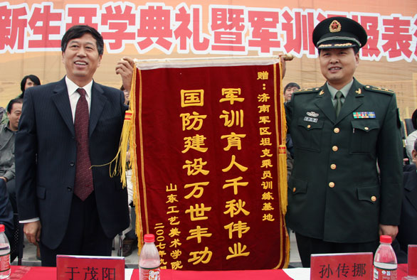 汇报表演结束后,校党委书记于茂阳代表学校向济南军区坦克训练基地赠送了锦旗。