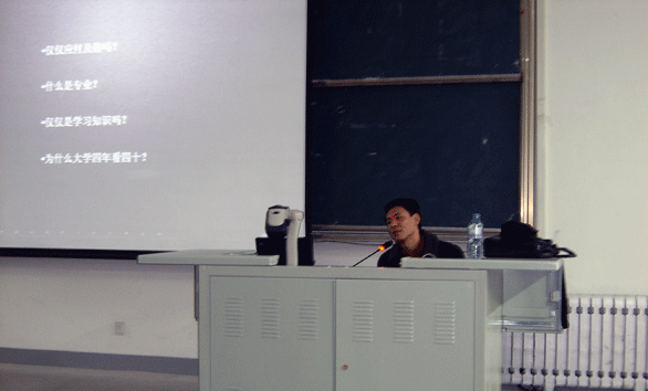 赵之鲲先后就职于广州蓝色创意广告公司、北京电通广告公司,现任济南潜意识广告公司总经理、创意总监。他首先从一些社会现象入手分析了近十年各方面显著的社会变化,以此切入重点讨论“大学四年,是韬光养略还是进入社会”。他提出“谁在逼你完成作业”、“仅仅是在应付及格吗”、“什么是专业”等与学生切身相关的9个疑问,引发学生主动思考,然后结合自身的经历,告知同学们,最好的艺术是“杂家”,大学四年不仅要学习专业知识,还要尽可能的拓展自己的知识面,拓宽视野,锻炼自己为人处世、沟通、表达、观察等各个方面的能力;不仅要对未来有美好的憧憬,更要为了美好的未来做好现在。他还告诫同学们,在考虑从业的问题时不能依赖父母、朋友,要调整好自己的心态,从基础做起,扎扎实实走好每一步将来才有可能成功。赵经理谦虚的态度和幽默的讲演博得同学们阵阵热烈的掌声,他独到的见解和宝贵的经验也让同学们受益匪浅。