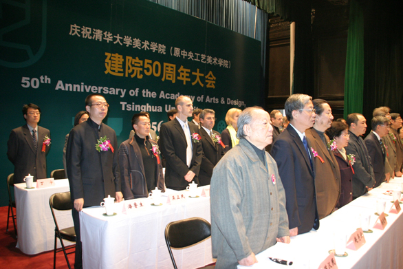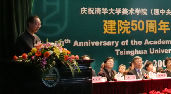 11月1日上午,清华大学美术学院(原中央工艺美术学院)建院50周年庆祝大会在清华大学大礼堂隆重举行。教育部副部长李卫红、中国轻工业联合会会长陈士能、中国文学艺术界联合会副主席冯远、中国美术家协会党组书记、常务副主席刘大为、清华大学校长顾秉林等到会祝贺并讲话,清华大学美术学院(原中央工艺美术学院)老院长张仃、常沙娜、王明旨等出席会议,清华大学美术学院院长李当岐、中央美术学院院长潘公凯、离退休教师代表陈汉民以及教师、学生、校友代表等先后致辞、发言,大会还举行了向张仃先生颁发“张仃励学金”捐赠证书仪式。大会由清华大学美术学院党委书记王进展主持。