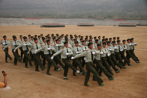 宣布表演开始,并检阅了各表演方阵。1500余名2006级新生排成18个整齐的方阵,在旗手带领下正步走过主席台,出席大会的领导起立鼓掌。新生们还表演了军体拳、正规化养成动作表演、女子匍匐刀表演等项目,表演过程中,1000余名新生在体育场中心排列成永利官网校徽的图案。整齐的动作、响亮的口号充分体现了新生们良好的精神面貌和优异的军训成果。