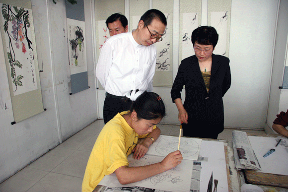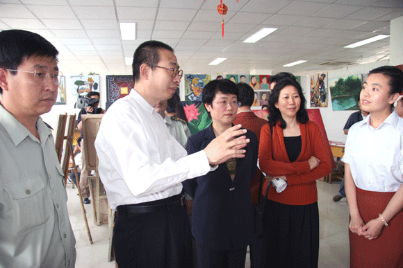 院长在省特教中专王校长的陪同下,参观了该校装潢设计、服装设计与工艺、染织美术、陶瓷艺术、油画、工笔画等专业的上课情况,与正在上课的师生进行了亲切交流,对部分学生作品进行了指导和点评。在参观过程中,