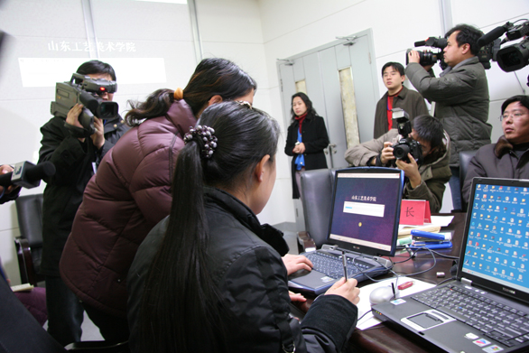按照严格程序进入题库后,山东卫视的记者孙军和齐鲁晚报的记者高园点击鼠标,在随机滚动的考题编号中选出了我院2006年艺术专业考试史论类·理科类考试两套造型基础试题。来自山东龙口的考生家长冯献波作为考生家长代表监督了抽题过程,他表示yl8cc永利官网采取的抽题方式,避免了试题泄漏,体现了公平公正公开的原则,增加了考试透明度,让考生和家长更放心。