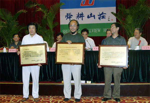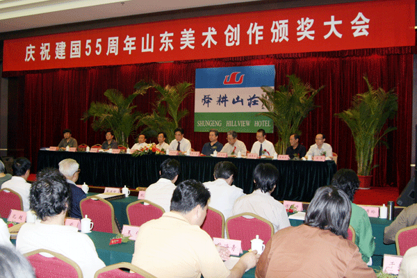 为表彰在第十届全国美展中为山东争得荣誉、为山东美术事业做出突出贡献的美术家及组织单位,由中共山东省委宣传部、山东省文化厅、山东省文学艺术界联合会主办,山东省美术家协会、山东省美术馆、山东画院承办的庆祝建国55周年山东美术创作颁奖大会于6月16日上午在舜耕山庄重华堂召开。省委宣传部副部长王凤胜,省文化厅副厅长李宗伟、省文联副主席我院原院长张一民等省文化厅、省文联的领导及我省德高望重的老艺术家、全省各地的美协负责人参加了颁奖大会。颁奖大会由省文联党组书记、省美协主席王承典主持。我院院长