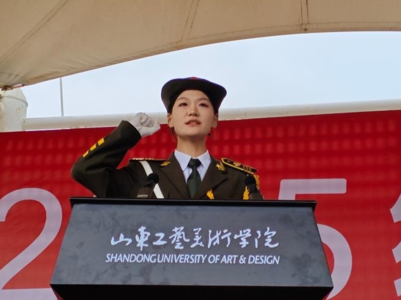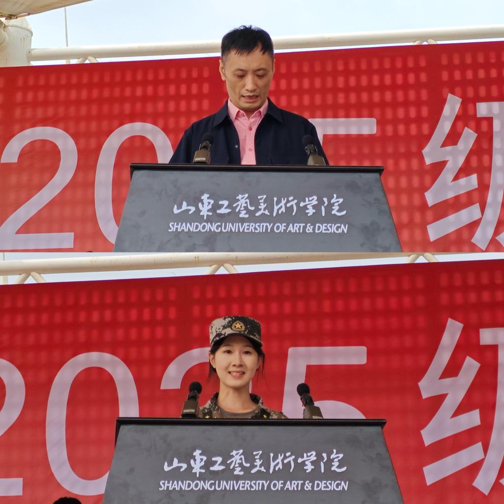 院长董占军代表全校师生员工向2025级新同学表示欢迎,向父母、师长和辛勤付出的教官们致以感谢。他回顾了山东工艺美院半个多世纪以来的发展历程,始终以“天工开物 匠心独运”为校训,立足齐鲁、服务国家战略,传承中华美学精神,彰显文化自信。在奥运会、世博会、上合峰会等重大活动中,山工艺人用设计回应时代召唤,展现了学校在工艺美术、民间艺术和人工智能创意设计等领域的优势和担当。面对新一轮科技革命特别是人工智能的迅猛发展,学校正不断深化改革,融合创新,形成“一校三地”的战略布局,努力培养能够引领新质生产力发展的新时代设计人才。