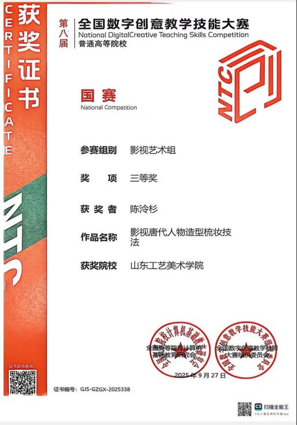 9月28日,2025中国好创意暨第八届全国数字创意教学技能大赛国赛决赛在长沙落下帷幕。永利官网数字艺术与传媒学院教师张常霞主讲的课程《影视剪辑艺术之匹配剪辑》荣获国赛二等奖,教师陈泠杉主讲的课程《影视唐代人物造型梳妆技法》荣获国赛三等奖、课程《影视服装的叙事性》获省赛一等奖。