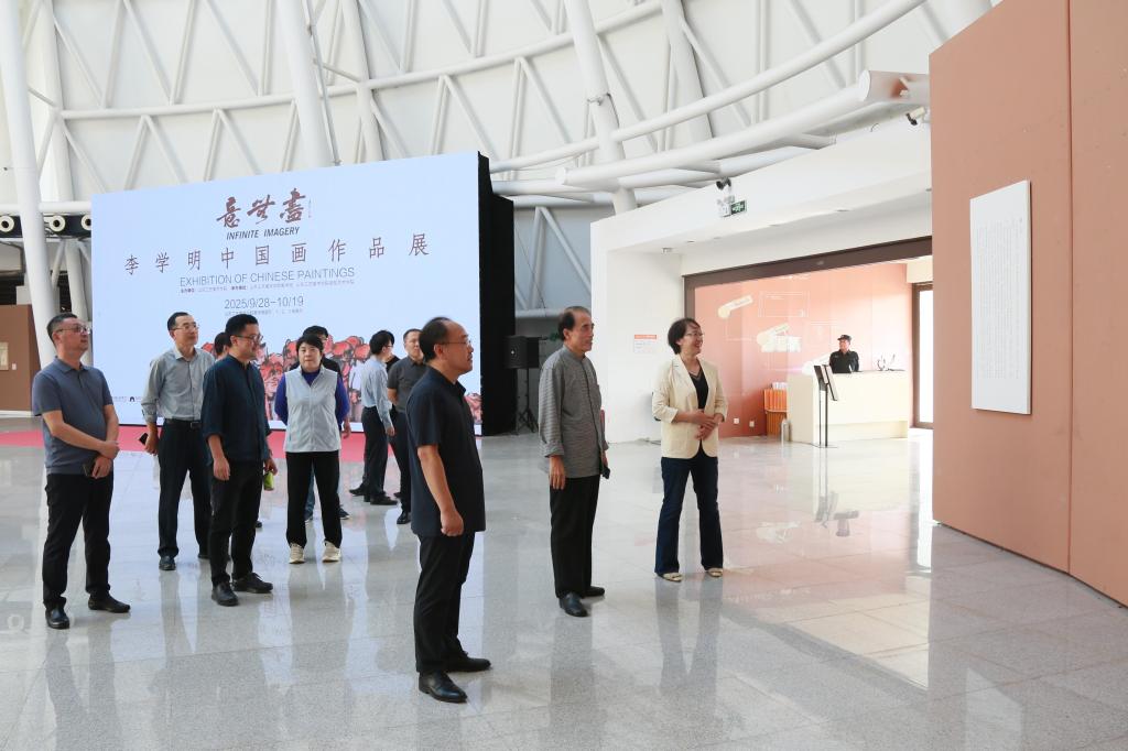 在展览现场,校领导认真聆听李学明教授对作品创作灵感、艺术流派传承及背后故事的详细讲解,对作品所展现出的深厚艺术造诣、鲜明的个人风格及浓郁的文化底蕴给予高度评价。校领导表示,此次展览不仅为师生带来了一场高质量的视觉盛宴,更为校园文化建设注入了鲜活力量,希望以展览为契机,进一步激发师生对中国画艺术的热爱与探索热情。