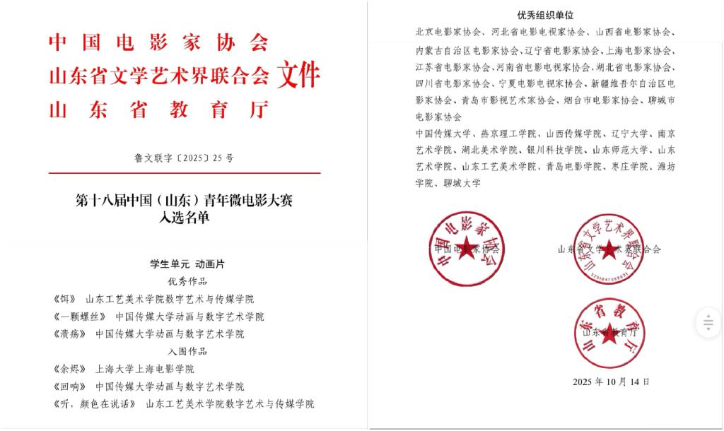 作为一项具有广泛影响力的影视类赛事,本次大赛由中国电影家协会、山东省文联、山东省教育厅主办,中国文联电影艺术中心、山东省影协等部门承办,共收到来自全国30个省级行政区及海外报送的作品1960部,经过严格的评审、公示等程序,最终确定学生单元动画片优秀作品3部,入围作品3部。