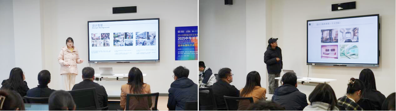 仪式后,工作坊在综合教学楼开展首次活动。本次活动聚焦市域列车创新设计,通过“专家辅导+方案优化+成果汇报”的模式开展。竞赛指导的专家团队通过分组研讨、一对一指导等方式,针对技术可行性、市场需求匹配度等关键问题进行专项辅导,助力学生突破设计瓶颈。各小组对工作坊成果方案进行汇报,学生们提出“模块化智能座舱”“未来交互体验变革”“CMF创新搭配”等突破性构想,并融合地域文化元素与前沿技术理念展开设计汇报。评审专家们从创新性、商业性及工程实现性等角度展开多维评议。最后,张蕊做总结陈述。