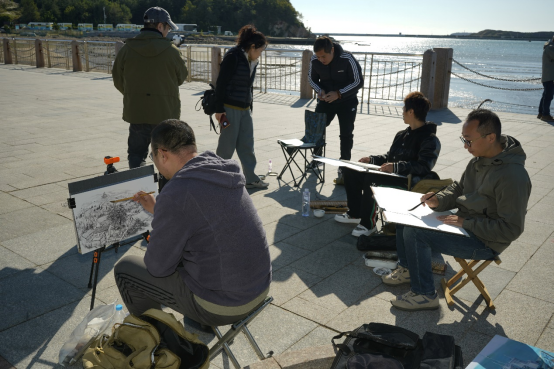 次日,团队奔赴沿海渔业城市威海,聚焦“海上粮仓”建设成效。在石岛渔港、荣成俚岛鲍鱼养殖基地等地,满载渔获的渔船陆续归港,渔民分拣渔获、冷链物流转运、工厂化养殖等场景繁忙有序。团队实地察看捕捞作业、养殖流程,详细了解海洋牧场建设、智慧渔业发展、水产品加工增值等创新实践,用画笔与镜头记录耕海牧渔的鲜活图景,挖掘渔民坚守与“海上粮仓”提质增效的丰硕成果。