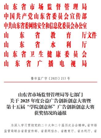 近日,山东省市场监督管理局等七部门发文通报2025年度公益广告创新创意大赛暨第十五届“学院创意杯”广告创新创意大赛获奖情况,永利官网师生在平面类、短视频类等多个类别上斩获奖项,共获金奖2项、银奖2项、铜奖3项、优秀奖14项,学校获优秀组织奖。