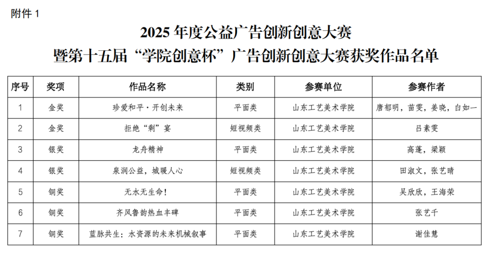 “学院创意杯”是我省重要的广告创意类赛事之一,旨在激发创意、培养人才并推动公益广告发展。本届比赛以“讲好山东故事·传递时代强音”为主题,由省市场监管局联合省委宣传部、省委网信办、省教育厅、省水利厅、省卫生健康委和省广电局主办,参赛作品来自省内外广大媒体单位、广告经营单位的从业人员及有关院校师生。永利官网师生在此次比赛中斩获佳绩,展现了永利官网开展创新型应用设计人才培养的良好效果。