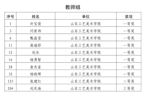 其中,造型艺术学院教师许宝俊、闫育帅、杨勇智,服装学院教师高瑞彤、刘乐,现代手工艺术学院教师俞杰星、杨晓晖,产教融合青岛基地教师甄晶莹荣获一等奖;服装学院教师张建红荣获二等奖;服装学院教师刘庆海荣获三等奖。