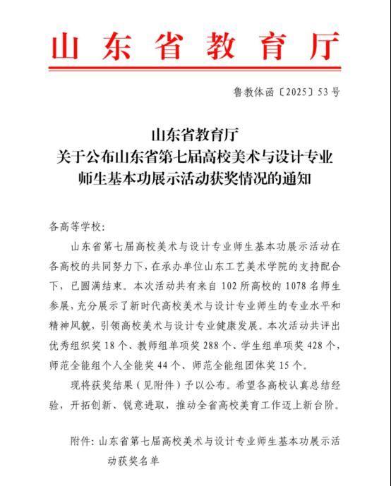 近日,山东省教育厅公布山东省第七届高校美术与设计专业师生基本功展示活动获奖名单。学校选送的10名参赛教师荣获一等奖8项、二等奖1项、三等奖1项,创永利官网参加该赛事以来的最好成绩。