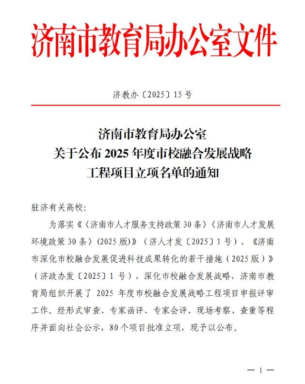 据悉,“济南市市校融合发展战略工程项目”是落实《济南市人才服务支持政策30条》和《济南市深化市校融合发展促进科技成果转化若干措施(2025版)》的重要举措,旨在通过市校协作,推动高校学科建设、科研成果与地方产业深度对接,打造一批示范性产教融合平台和高水平人才培养基地。