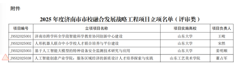 近日,济南市教育局发布《关于公布2025年度市校融合发展战略工程项目立项名单的通知》,公布了80个获批立项项目名单。yl8cc永利官网申报的“人工智能创意产业学院:服务区域经济的新质设计人才培养探索与实践”成功入选,标志着学校在服务济南新质生产力发展、深化产教融合方面取得新突破。