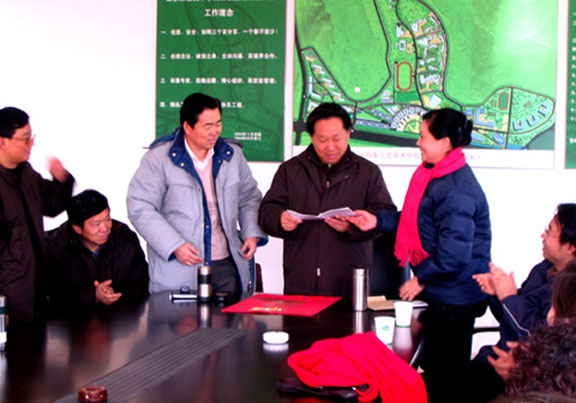 新校区基本建设总指挥王秀存副院长携全体建设者对慰问者的到来,表示了热烈的欢迎和热情的接待。在短暂的慰问、欢迎仪式上,慰问者和建设者们相互拜年、相互祝福,王秀存副院长全面的介绍了新校区建设工程进展的情况、工期确保的措施、各项制度的健全、宏伟蓝图的展望,得到了慰问者们的共鸣。刁在祥书记作为分管工会工作的院领导,代表老校区的教职员工给予了新校区建设者们以较高的评价:非常能吃苦,非常有战斗力,非常能奉献,非常顾全大局。同时,刁在祥书记又代表新校区建设招标办公室介绍了招标工作的两服务(为新校区建设服务,为招标项目的主管部门服务)、三公(公开公平公正)、四统一(廉洁、工期、质量、价格的有机统一)的工作原则。院工会江德华主席、郑淑华副主席代表工会组织向新校区建设者们每人赠送了一份团体人身保险(附加意外伤害医疗保险),向新校区赠送了12件用于夜间值班御寒用的军大衣,把老校区教职员工的温暖和呵护送到了新校区建设第一线,体现了以人为本的工作方针,使新校区的建设者们感动万分、干劲倍增,纷纷表示坚决完成院党委交予的历史使命,保证质量、工期、安全三个百分之百一个都不少。