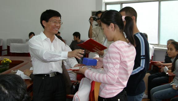 首先,牛序茜就邓小平同志的丰功伟绩、高尚品质、生平经历以及开展此次征文活动的意义作了介绍,号召大家高举邓小平理论的伟大旗帜,为建设有中国特色的社会主义事业增砖添瓦。随后,王妍就此次征文活动的稿件征集、稿件筛选及稿件评选等具体情况作了说明。袁文昌宣读了获奖同学名单,张妮、赵玉莲、王朋辉获得一等奖;刘涛、赵建伟等7人获得二等奖;杨淑芹、韩明等10人获得三等奖;史魁、王洪洲等20人获得优秀奖。在热烈的掌声中,张云龙、牛序茜、袁文昌、王妍以及各系部党、团支部书记为获奖同学颁发了奖品和荣誉证书。
