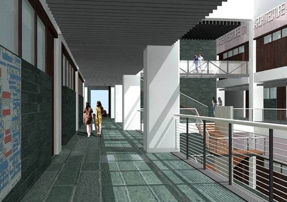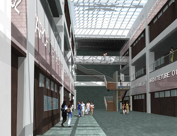 比如教室。天光教室、模特训练厅就不用说了,完全符合专业标准。标准教室每间80平方米。各班级有自己的固定教室,教务处、学生处、团委、各系部的办公室靠近学生,符合目前的教学模式需要,同时,适应未来,把建筑框架和基础设施做成“活”的,便于将来重新分隔组合。教室里可以安放小型设备、工具、电脑,既是课堂,又是制作间。每20间教室设置一间80平方米教师休息室。教学楼内中间有宽大天井,每个系可以摊到一处,但属共享性展示交流空间。三层以上的用玻璃顶采天光,三层以下的用两侧的通透处采光,通风流畅。