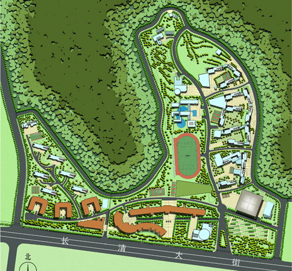 从平面图形上看(俯视),各功能区相对独立围合成一个小整体,各功能区之间有呼应关系,有一股“气”贯穿其中,使全校区形成一个严整有序的优美图形。