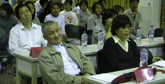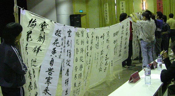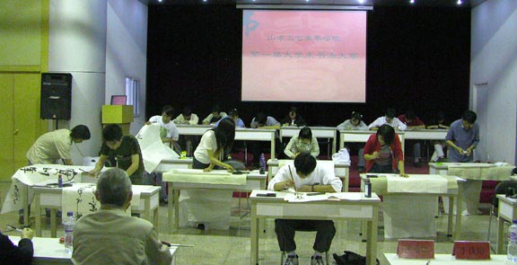 比赛现场墨香飘溢,选手也都各显身手,硬笔、软笔同时进行,现场气氛紧张而热烈。经过三十分钟的激烈角逐,选手们各自完成了自己的作品,风格多样,或粗狂豪放,或刚劲有力,或清爽飘逸。我院党委书记于茂阳、老干部王少英老师、图书馆李龙潭老师、美术系李丽娜老师、保卫科辛志铁老师作为评委对现场作品进行了公开评选。大赛特邀评委王少英老师对大赛做了点评,他谈到:“对于书法创作,同学们可能还存在或多或少的问题,练习书法应该有严谨的学风。”接着,于茂阳书记做了最后点评,他说,书法的优劣好坏主要从两个方面去评论,一是对传统的继承;二是在传统的基础上要有个性。他还提出了一个公式:书法的功力=传统的积累+悟性≠实践+时间,练习过程中要重视临摹碑帖,“不临摹碑帖,要想取得一定成就是不容易的。”