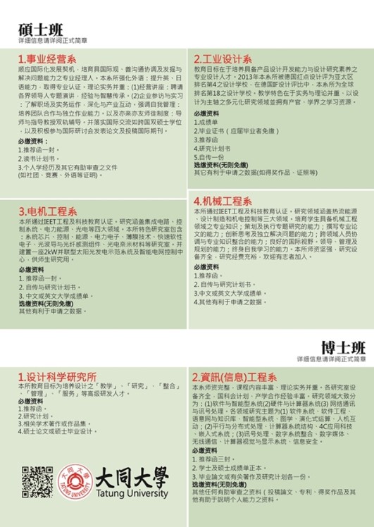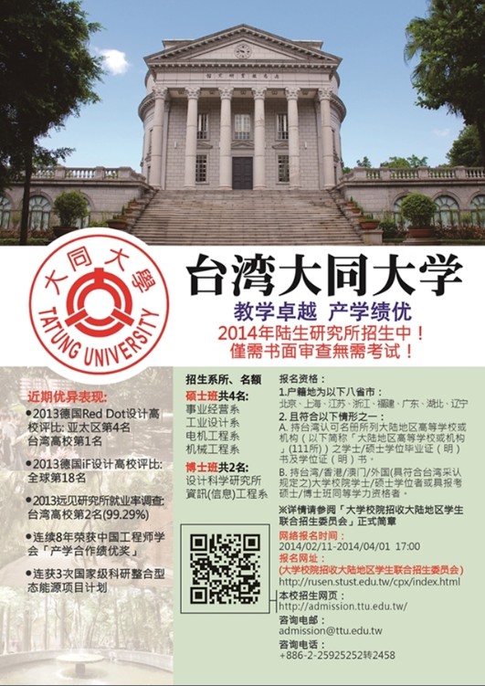 台湾大同大学2014年陆生研究所(硕、博士班)招生