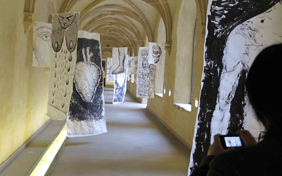 与会中欧两国学者在论坛发言中多次提及王瑞青创作的装置艺术作品《卷·语》,并给予了高度评价。与会者认为,王瑞青的创作是对古老文字拓印技术的转译与保护。作品中出现的“三字经”等文字和符号,并非仅仅以其本来的内容和意义而存在,更在于它们在现代装置形式中所产生的艺术美感。艺术家所用的中国传统水墨画“计白当黑”的表现手法,体现了中国古老哲学中“阴阳相克相生”的造物理念。展览中,将平面化的传统水墨意象以立体装置艺术的形式配合创作影像进行展示,实现了传统与当代、东方与西方在艺术理念上的对话与融合。这种用现代材料、工具、观念与传统工艺结合的艺术创作手法,在对文字符号的解构与重建中,获得了一种创造新形式和新图像的书写方式,是一次别出心裁的装置艺术创作。
