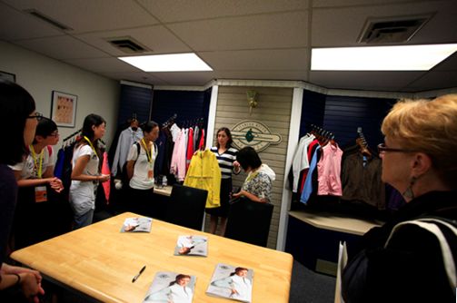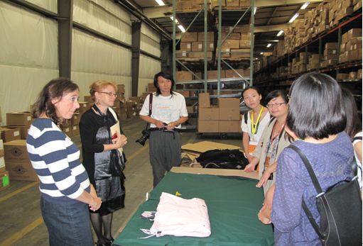 当地时间9月24日下午代表团一行在拉塞尔大学服装学院院长Mary Ruppert教授的陪同下,首先参观美国CHARLES RIVER服装公司。CHARLES RIVER服装公司是美国一个服装各大品牌的加工制作公司,为美国大学球队,大型超市及著名“可口可乐”公司设计各季校服,队服及工作服装等,通过代理商在大型超级市场出售,并通过派往世界各地的代理人员反映销售及服装自身问题,进行下一季品牌研发。设计总监向代表团展示了公司服装,使代表团对美国大学学生校服队服及工作服在款式,色彩等方面有了很直观得了解。参观过程中代表团提出了很多关于市场营销与服装制作的专业问题,并得到了很好的解答。代表团了解到CHARLES RIVER服装公司在工艺流程方面,首先根据市场调研自行设计款式,然后将制版与制作交予中国,巴勒斯坦等国家进行加工,最终再由自己完成LOGO的设计与制作部分。并了解到此运作模式为美国服装公司普遍营销模式。CHARLES RIVER服装公司在最终服装成品的检察方面相当严苛,从而保证在世界各地加工的服装都能符合自己的品牌要求。通过这次参观,学生更多地了解到美国服装品牌的产业链,使代表团学生深受启发。