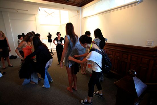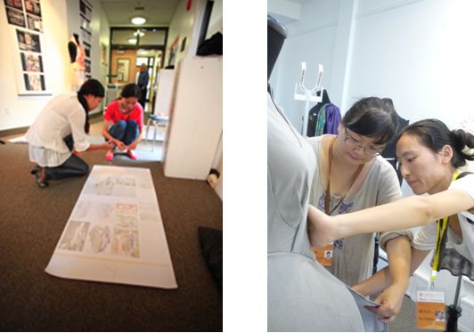9月24日下午的活动,主要是针对25日、26日永利官网与拉塞尔大学共同参加波士顿地区的服装展。这次展览包括动态展和静态展两部分,动态展是以时装秀的形式展示永利官网毕业生的优秀毕业作品,静态展是通过展板的形式展现双方师生这次服装产品开发课程的合作过程。在布展过程中,双方师生相互协作,顺利完成了模特试衣和静态布展工作。布展之后,代表团由拉塞尔大学教师带领参观拉塞尔服装设计工作室,课堂环境,教学工具。