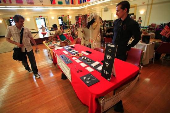 9月25日,美国拉塞尔大学服装学院院长Mary Ruppert教授陪同yl8cc永利官网服装学院代表团师生参观了波士顿地区的独立设计师市场。这是一个波士顿地区独立艺术家和设计师展销自己作品的场所,是波士顿商业服装展的一部分。展区分两层,内有大量展位,包括服装类、首饰类,以及绘画作品,这些作品均有设计师自己设计并制作完成。这些作品在材质选用、技法表现上极具想象力,代表团师生表现了极大兴趣。