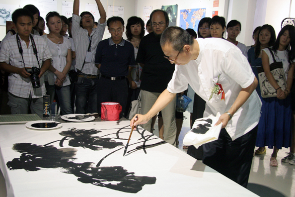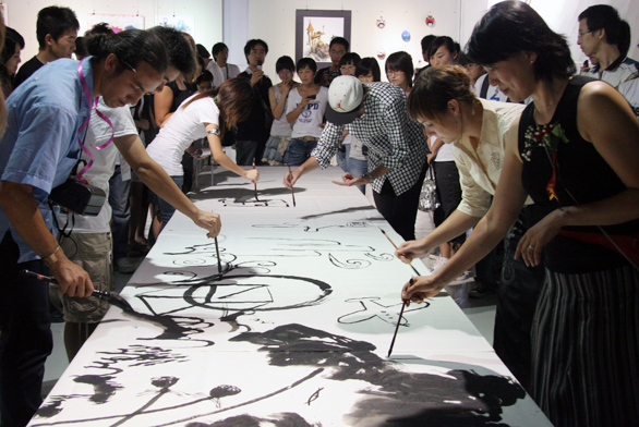 潘鲁生院长与广大师生一起参观了学生作品汇报展,并与中美两国学生一起即兴作画,以此留念。