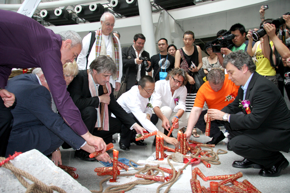 在参观过程中,校领导与来宾还一起点燃红烛为四川灾区人民祈福。