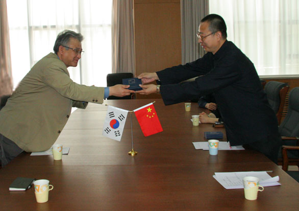 4月26日,韩国大庆大学副校长俞普善、国际交流处处长崔东洛访问永利官网,院长潘鲁生,副院长李新、张云龙,院长助理、办公室主任王立果,应用设计学院院长任仲全、党总支书记扈国珍在长清校区贵宾接待室与俞普善副校长一行就双方合作问题进行了座谈。