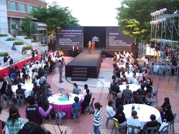 下午6点10分,代表团一行参加了在大庆大学校园举行的2007年国际美容大赛交流之夜。出席了开幕仪式、冷餐会、作品交流活动、和谐之夜、大庆妆扮艺术展示等活动,度过了一个难忘的激情四射的妆扮艺术活动之夜。在开幕式上,来自不同国家的学校代表进行了发言,康健处长代表yl8cc永利官网发言。