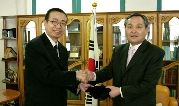 潘鲁生院长拜会了校长金达雄教授。两位校长愉快地回顾了自从2004年12月以来yl8cc永利官网与韩国庆北大学的学术交流活动,双方都认为这些活动对两所学校教授作品的提高是非常有意义的,为今后双方全面合作打下了坚实的基础。双方希望尽快签署友好学校的协议,为今后的全面学术合作积极努力。在庆北大学学艺术学院院长朴南姬教授的陪同下,