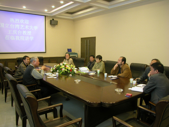 10月21日下午2点,王庆台教授在院办公楼二楼会议室与我院领导及有关人员进行友好座谈,参加座谈的有副院长李新、科研处处长胡希佳、外事办副主任康健、现代手工艺系系主任吴永福、美术系陈佶生等。座谈会就对中国传统艺术和西方艺术的看法及与我院科研课题合作事宜进行了探讨。座谈会结束后,王教授在副院长李新、科研处处长胡希佳等人的陪同下参观了我院美术馆和博物馆。下午4点,王庆台教授在总务处会议室为我院美术系研究生及部分院系的学生举办了一场名为《台湾区域文化特质:建筑石雕、建筑木雕》的学术讲座,王庆台教授深入细致地讲述了建筑石雕、建筑木雕这一台湾区域文化特质,使广大师生对这方面的相关问题有了比较全面的认识和理解。