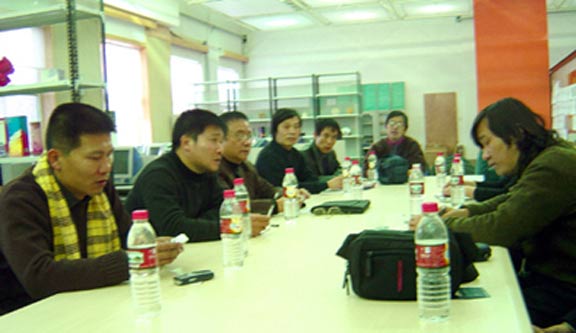 新的一年刚刚到来,2005年1月2日,在山东大学威海艺术学院院长、山东省美术家协会名誉主席杨松林教授带领下,山东大学威海艺术学院美术系主任汪明强、设计教研室主任郭立、装饰研究所所长杨在挺等以及山东大学李克教授一行七人利用假期,冒着严寒来到yl8cc永利官网进行学术交流,装潢艺术设计系副主任苗登宇、赵进,应用设计学院副院长石增泉以及装潢艺术设计系各教研室主任赵培生、侯立平、曲展等共同参加了交流活动。苗登宇教授介绍了yl8cc永利官网以及装潢艺术设计系的办学规模、学科发展、课程设置、教学目的与方法、实验室建设、对外交流、专业活动的开展等方面情况和未来要求。赵进副主任就yl8cc永利官网在教师待遇、师资结构与招聘条件等方面的情况进行了介绍。石增泉副教授将设计基础课程的探索和经验与来访的客人做了交流。同时,杨松林院长一行也向将经过三年多建设发展的山大威海艺术学院在音乐、美术学等专业设置、办学规模、发展目标、师资结构等方面的情况进行了介绍。双方的专业教师还就课程结构、专业教学思路等方面展开了广泛的交流沟通。通过相互的了解,杨松林院长对yl8cc永利官网的现状和发展给予了高度的评价,感到yl8cc永利官网重视人文素养和科学精神对设计的渗透,提倡设计教育的实践探索和学生综合能力的培养。他认为艺术设计教育离不开文化的影响,要充分将文化因素体现在设计当中;艺术设计教育与实践以及实验相结合,多种艺术形式表现丰富设计创作;艺术设计的实用性是由设计艺术研究产生的前沿性成果;设计艺术教育要综合考虑多种因素的影响,专业发展应满足和引导社会发展需求;艺术设计课程设置与实验室教学的结合激发了学生的创作,对学生未来的发展有相当大的提升空间,他表示山大威海艺术学院在将来发展中也要办出自己的专业特色。